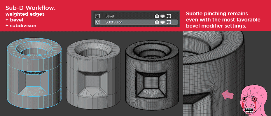 Here we have a simple Sub-D comparison to remesher while using the exact same topology without any extra support loops. If you are familiar with 3D modeling you probably know that cylindrical elements with extruded/intruded parts can be quite unforgiving when it comes to pinching: