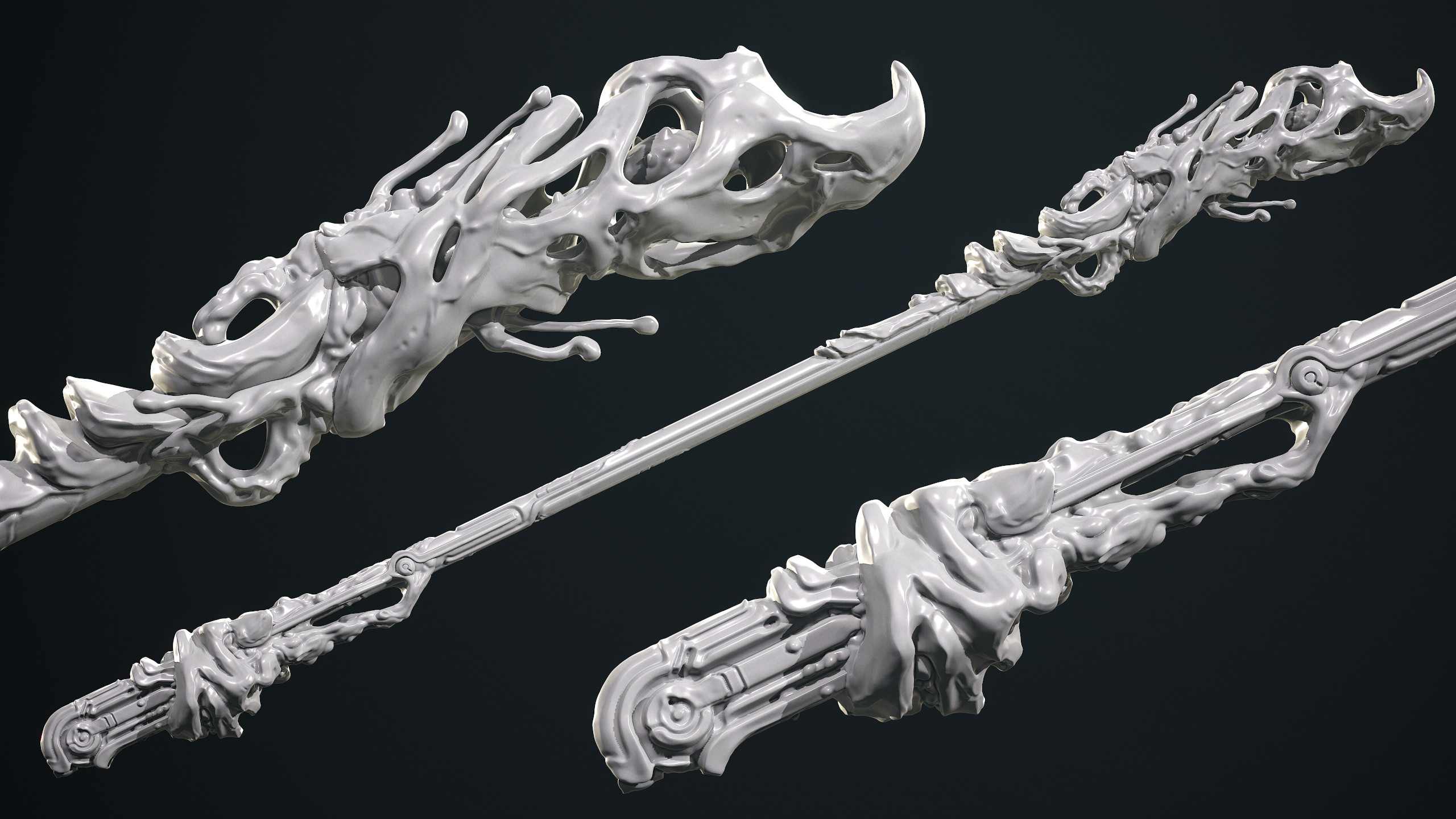 A two-pronged attack; the bone-grafted cocoon at the tip of this staff rends flesh, while the viral mass living within spreads itself into the wounds of each new victim.
